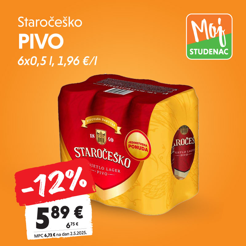 Pivo Pan -37% 0,99 € 1,59 € zlatni, 0,5 l, 1,98 €/l Vrijedi od 18.03.2026. do 24.03.2026. MPC 1,49 € na dan 2.05.2025.