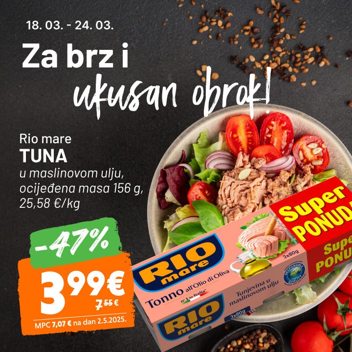 Tuna Tri Marine -35% 1,85 € 2,89 € komadi, ocijeđena masa 130 g, 14,23 €/kg Vrijedi od 18.03.2026. do 24.03.2026. MPC 2,79 € na dan 2.05.2025.