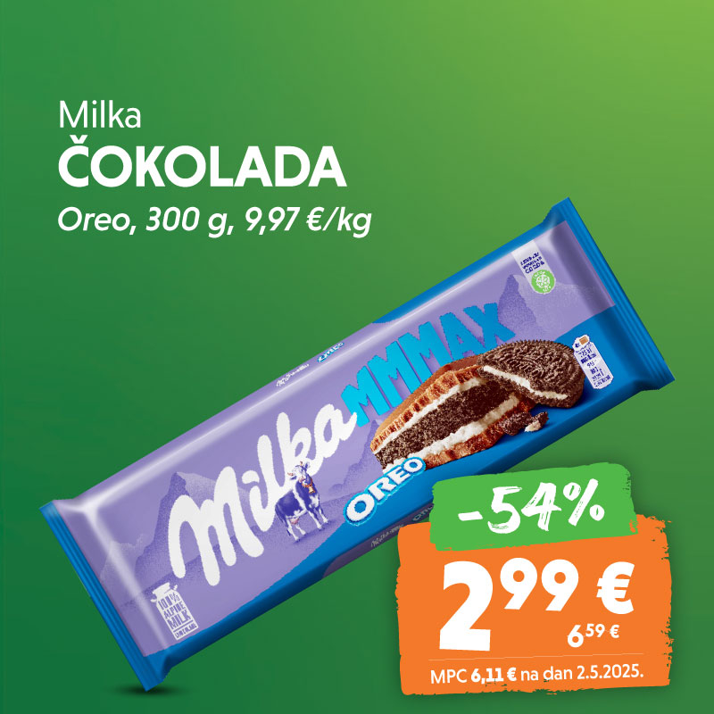 Čokolada Milka -54% 2,99 € 6,59 € Oreo, 300 g, 9,97 €/kg Vrijedi od 3.12.2025. do 9.12.2025. MPC 6,11 € na dan 2.05.2025.